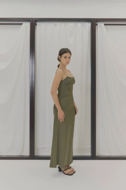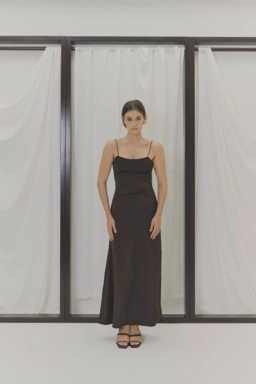 Viena, crafted in a rich, decadent satin that flows like liquid, the dress features a slender, floor-grazing column silhouette. Delicate spaghetti straps frame a subtly scooped neckline, while the back surprises with a small, elegant keyhole cutout.