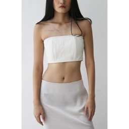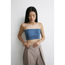 A denim bandeau top with contrast stitch, a princess cut, and an accordion back to ensure the garment hugs each individual perfectly.