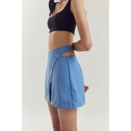 A structed skirt designed to fit mid-rise, offering a straight fit, featuring an asymmetric wrap detail.