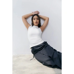 A slightly cropped top with side ruching details, asymetrical neckline and hem. Comes in Black, Maroon, and White.