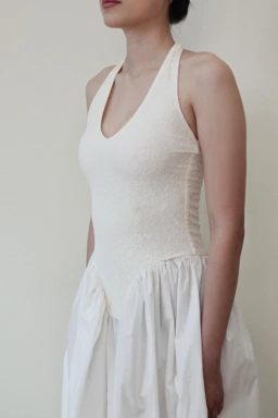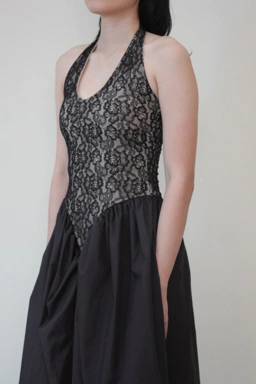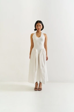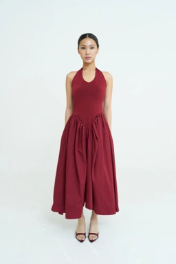 A midi dress with a flared skirt, drop-waist ruching, halter neckline, and adjustable straps.