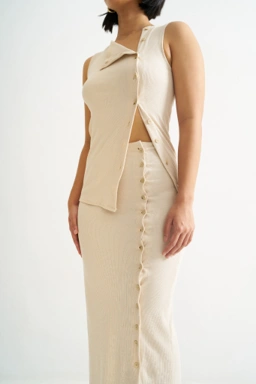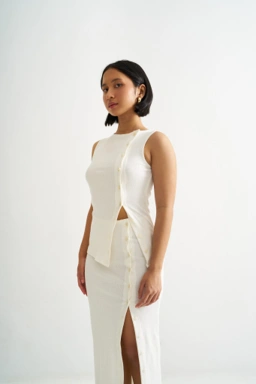 A sleeveless rib top with front button detailing.