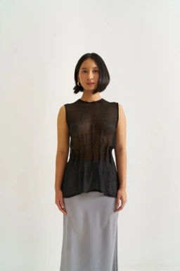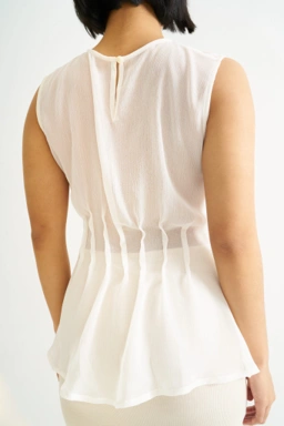 A sheer-textured sleeveless top with piping detailing and flared-out drop waist.