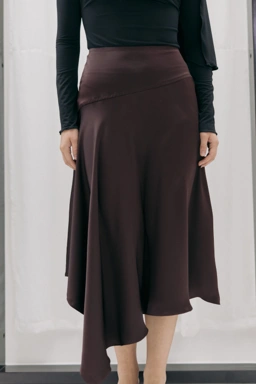 Anna is tailored in a supple, semi matte satin. It features a fitted, high-waist yoke with a distinctive diagonal seam detail. The body flares into a midi-length silhouette, culminating in a dramatic asymmetrical hem that dips lower on one side, ensuring a striking, fluid sweep with every step.